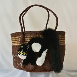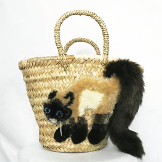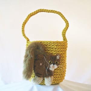 毛糸でモコモコに刺繍した猫ちゃんと、ふわふわロングなシッポがポイントのかごバッグです。