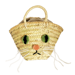 モロッコ製のミニサイズのカゴに、ネコちゃんのお顔をモコモコ刺繍で表現しました。揺れるおひげがフリンジのような楽しいバッグ。