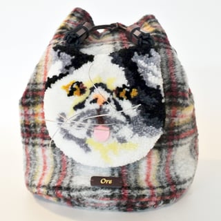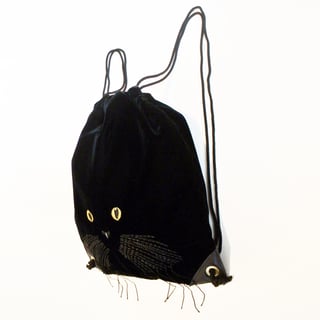 ベルベット地にネコの顔を刺繍したバックパックです。