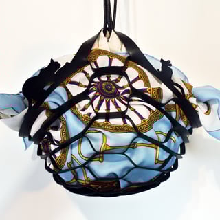 たたむとペタンコになるメッシュバッグに、1点もののヴィンテージのスカーフをセットしました。付属の巾着をセットすればショルダーバッグとしてもお使いいただけます。