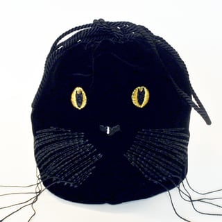 Cat face is embroidered on a velvet purse with a drawstring cord.